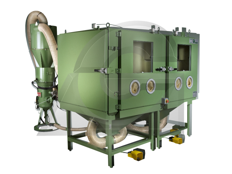 As granalhadoras “duplas” da família “S22 - S28 - S32” são caracterizadas por volumes particularmente generosos e de mais postos de trabalho tornando possível o tratamento de peças de grande dimensão. São equipadas com um sistema de jateamento em pressão permitindo potencia de trabalho, tal como decapagem, e velocidade de produção até 5 vezes superior ao sistema clássico em depressão.